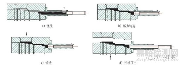 鑄鍛雙控成形技術(shù)是針對(duì)壓鑄、重力鑄造存在的鑄造缺陷而提出的一種成形方法。它是將鑄造和鍛造兩種成形方式先后在同一模具、同一生產(chǎn)過程一次完成零件的生產(chǎn),其成形過程如圖8所示 [15,16]。