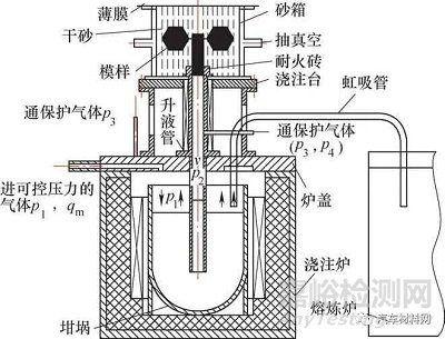 真空低壓消失模鑄造技術(shù)是將真空消失模鑄造與低壓鑄造有機(jī)地結(jié)合起來,綜合了低壓鑄造與真空消失模鑄造的技術(shù)優(yōu)勢(shì),在可控的氣壓下完成充型過程,大幅提高了合金的充型能力;與壓鑄相比,設(shè)備投資小、成本低、鑄件可熱處理強(qiáng)化;而與砂型鑄造相比,鑄件的精度高、表面粗糙度值低、生產(chǎn)率高、性能好;在反重力作用下,直澆口成為補(bǔ)縮短通道,澆注溫度的損失小,液態(tài)合金在可控的壓力下進(jìn)行補(bǔ)縮凝固,合金鑄件的澆注系統(tǒng)簡(jiǎn)單有效、成品率高、組織致密;需要的澆注溫度低,適合于多種有色合金澆注成形[28,29]。其原理如圖12所示。