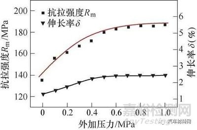 圖16 外加壓力對(duì)ZL101試樣抗拉強(qiáng)度與伸長(zhǎng)率的影響