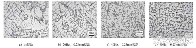 圖18所示為750℃澆注時(shí)不同振動(dòng)頻率ZL101鋁合金消失模鑄造振動(dòng)凝固與無振動(dòng)的金相組織比較。在ZL101鋁合金消失模凝固過程中進(jìn)行不同頻率的垂直振動(dòng),組織明顯細(xì)化。
