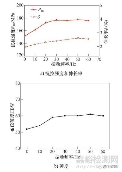 圖19 不同振動(dòng)頻率下試樣抗拉強(qiáng)度、伸長(zhǎng)率和硬度的變化