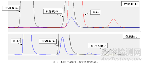 首先,談?wù)?alpha;對色譜條件選擇的影響,α(選擇性)的主要影響因素體現(xiàn)為色譜柱,根據(jù)化合物的結(jié)構(gòu)特點選擇不同的色譜柱型號,如目標物S為含多個-OH及-COOH結(jié)構(gòu)的化合物,勢必C18柱無法實現(xiàn)有關(guān)物質(zhì)的方法開發(fā),因為其主成分的tR時間極可能為2min左右的溶劑出峰位置出峰,也就是隨著t0就被洗脫了,那么就可以考慮改用C8或者-NH2柱進行分析。在根據(jù)待分析物的結(jié)構(gòu)特征擬定了色譜柱的型號之后,不同的廠家的選用的硅膠處理技術(shù)不同,還會給選擇性帶來很顯著的差異,如在開發(fā)化合物S的異構(gòu)體方法過程中,選用色譜柱1時,無論流動相的比例如何調(diào)整,特定雜質(zhì)S-1始終與異構(gòu)體雜質(zhì)重合,但是當(dāng)選用色譜柱2后,特定雜質(zhì)不再干擾異構(gòu)體雜質(zhì)的測定,如圖1所示(BM-A),可見,色譜柱是α的關(guān)鍵風(fēng)險因素,在優(yōu)化分離度過程中,特別是組分的k值很大,且有重疊時,改變α是關(guān)鍵。