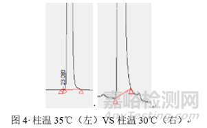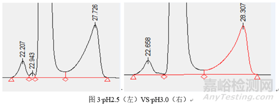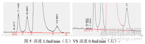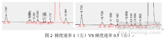 其次,談?wù)刱對色譜條件選擇的影響,k(保留值)的影響因素相對較多,比如色譜柱,流動相,柱溫,流速等均會對保留值帶來影響,那么如何協(xié)調(diào)幾個因素,在較短的時間內(nèi)找到合適的色譜條件呢,通常先選定色譜柱,柱溫和流速可以預(yù)先設(shè)定值進行固定,然后擬定流動相,如有機相選擇單相的甲醇或乙腈,或者多相結(jié)合,水相選擇水,酸性水如磷酸水、三氟乙酸水或者醋酸水等,或者緩沖鹽,或者堿性水如三乙胺水等。流動相的種類確定之后就是洗脫方式的選擇對待分析的有關(guān)物質(zhì)進行分析了。如有關(guān)物質(zhì)的方法開發(fā)時,有關(guān)物質(zhì)包括中間體、副產(chǎn)物和降解產(chǎn)物等,各化合物的極性差別較大,多采用梯度洗脫的方法同時分析幾個雜質(zhì),此時變化梯度的速率就是影響k值的一個表現(xiàn),如圖2所示。另外,在梯度變化對k值的影響較小時,可以通過改變pH值調(diào)節(jié)各化合物的k值而實現(xiàn)分離,如圖3所示。此外,有時候僅僅是變化柱溫和流速也可以使k值發(fā)生變化,達到有效的分離目的,如圖4和圖5所示。