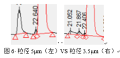 最后,談?wù)刵對色譜條件選擇的影響,柱效在色譜條件中同樣發(fā)揮著重要的作用,在方法開發(fā)的過程中時而出現(xiàn)擬定的色譜條件無法達到系統(tǒng)適用性中的分離度的要求了,可能我們會懷疑自己的流動相比例是不是設(shè)置錯了,那個參數(shù)不對了,自己配制的流動相是不是出現(xiàn)了偏差,此時,出現(xiàn)偏差的可能就是色譜柱了,某些化合物的分離對柱子的柱效要求比較高,當(dāng)柱效降低之后就會發(fā)生分離度不能滿足要求的情況發(fā)生。那么在方法開發(fā)過程中柱效是不是也同樣重要,答案是肯定的,在兩個極性極為接近的化合物的分離中,因為k值接近,無論變化哪些參數(shù),均無能為力的時候,可以考慮選擇柱效更高的色譜柱,那么如何提高色譜柱的柱效呢,可以通過更小內(nèi)徑和粒徑的色譜填料實現(xiàn),但是同樣需要兼顧選用的液相的耐受的最高壓力,避免方法無法實施。如圖6所示,即為選用更高柱效的色譜柱后,實現(xiàn)了某個未知雜質(zhì)間的有效分離。在k值接近的時候,選擇改變n也是行之有效的方法。
