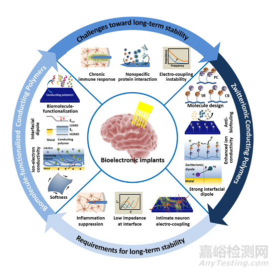 生物電子植入器件已廣泛應(yīng)用于神經(jīng)假體、腦機(jī)接口和其他生物集成設(shè)備來進(jìn)行檢測(cè)和記錄生物信號(hào)。然而目前商業(yè)植入電極,由金屬或硅制成,這些材料的剛性性質(zhì),使得電極和組織之間的機(jī)械性能不匹配,導(dǎo)致異物反應(yīng)甚至器件故障。且這些電極材料的表面可能通過非特異性相互作用吸附蛋白質(zhì),觸發(fā)異物反應(yīng)。此外,這類材料表現(xiàn)為化學(xué)惰性,難以與生物分子之間形成穩(wěn)定的相互作用。
