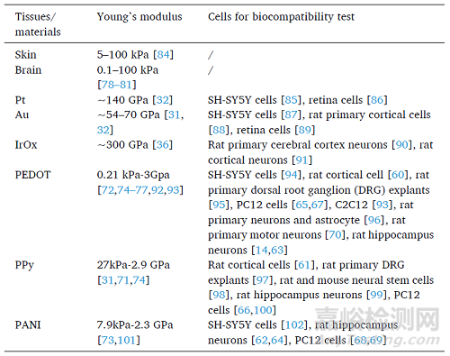 表1 總結(jié)了導(dǎo)電材料的楊氏模量和生物相容性
