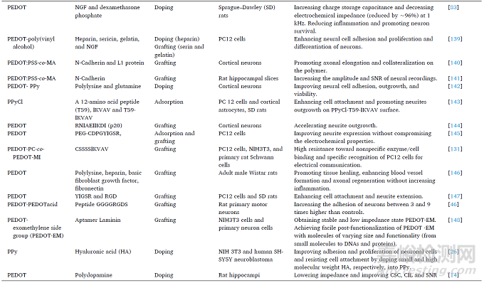 導(dǎo)電高分子(CPs)具有優(yōu)于無機(jī)材料和金屬材料的優(yōu)點(diǎn):1.CPs的彈性模量遠(yuǎn)低于無機(jī)材料和金屬材料,從而最大限度地減少了機(jī)械失配,減少了設(shè)備-組織界面處的應(yīng)力集中。2.將CPs涂覆在電極上,通過顯著降低整體設(shè)備阻抗,顯著改善了體外和體內(nèi)組織記錄部位的電偶聯(lián)。且CP電極由于其巨大的體積電容,為生物安全刺激也提供了高電荷存儲(chǔ)和注入能力。3.生物分子改性的CPs能夠增強(qiáng)與神經(jīng)元界面的相互作用并減少炎癥反應(yīng)。然而,生物分子的表面修飾通常不能解決非特異性蛋白質(zhì)吸附問題。這將增加界面阻抗,甚至引發(fā)免疫反應(yīng)。