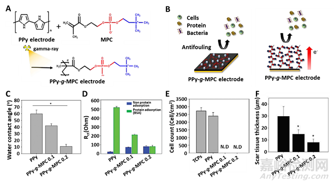 圖4. 2-甲基丙烯酰氧乙基磷酸膽堿(MPC)修飾的PPy電極實(shí)現(xiàn)抗非特異性黏附及抑制疤痕組織