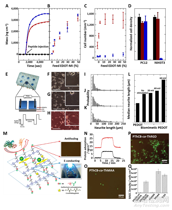 最近,兩性離子CPs在減少非特異性細(xì)胞/蛋白質(zhì)相互作用方面表現(xiàn)突出,并能在低阻抗下實(shí)現(xiàn)與細(xì)胞/組織有效電通信。兩性離子CPs除了具有CPs的混合離子-電子電導(dǎo)率外,其兩性離子成分還增強(qiáng)的離子電導(dǎo)率和金屬-導(dǎo)電高分子的電偶聯(lián),進(jìn)一步促進(jìn)電極與細(xì)胞/組織之間的電荷轉(zhuǎn)移。兩性離子CPs與其他親水性CPs相比,在防污、水穩(wěn)定性、低炎癥和電化學(xué)性能方面也具有優(yōu)勢(shì),并已廣泛應(yīng)用于體內(nèi)和體外生物電子器件中。此外,兩性離子CPs可以通過耦合的細(xì)胞識(shí)別分子為細(xì)胞提供附著點(diǎn)。鑒于這些優(yōu)勢(shì),兩性離子CPs有望解決上述導(dǎo)電高分子的局限性。