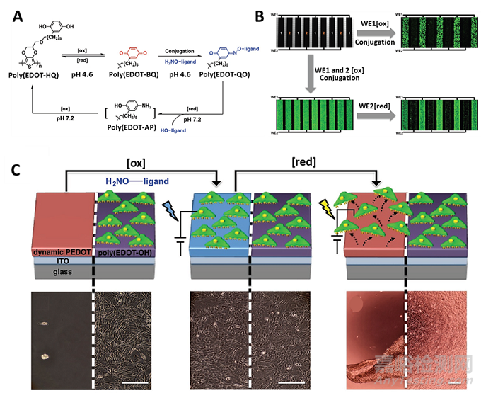 目前,臨床實(shí)驗(yàn)中,植入器件停止功能或治療完成后,往往面臨著重新植入或移除的問題。然而,器件的再植入比最初的植入更復(fù)雜,因?yàn)榈诙问中g(shù)可能會(huì)導(dǎo)致組織損傷,并削弱再植入后的身體功能。研究者通過模擬自然界整合素-細(xì)胞外基質(zhì)的動(dòng)態(tài)相互作用,開發(fā)了一種動(dòng)態(tài)兩性離子EDOT共聚物,可實(shí)現(xiàn)可控地控制細(xì)胞的粘附和釋放。