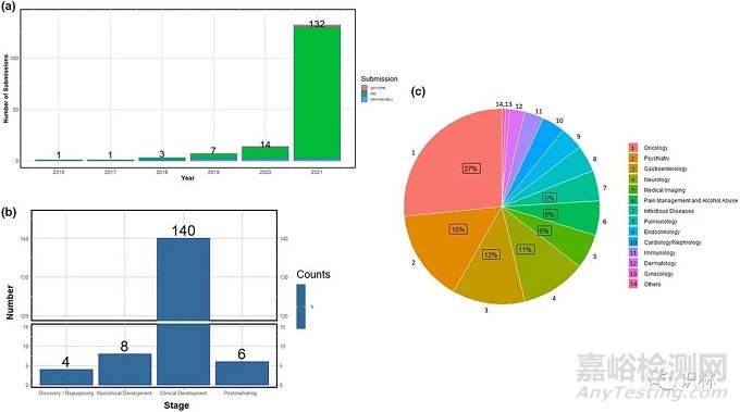 (a)按年份顯示包含 AI/ML 內(nèi)容的申報(bào)分布情況;(b)按治療領(lǐng)域顯示包含 AI/ML 內(nèi)容的申報(bào)分布情況;(c)按治療藥研發(fā)生命周期顯示包含 AI/ML 內(nèi)容的申報(bào)分布情況。