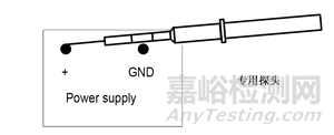 圖5所示為一種專用示波器探頭直接與波測(cè)電源靠接。專用示波器探頭上有個(gè)地線環(huán),其探頭的尖端接觸電源輸出正極,地線環(huán)接觸電源的負(fù)極(GND),接觸要可靠。