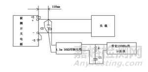 國(guó)家標(biāo)準(zhǔn)規(guī)定在被測(cè)電源輸出正、負(fù)端小于150mm處并聯(lián)兩個(gè)電容C2及C3,C2為22μF電解電容,C3為0.47μF薄膜電容。在這兩個(gè)電容的連接端接負(fù)載及不超過(guò)1.5m長(zhǎng)的50Ω同軸電纜,同軸電纜的另一端連接一個(gè)50Ω的電阻R和串接一個(gè)4700pF的電容C1后接入示波器,示波器的帶寬為100MHz。同軸電纜的兩端連接線應(yīng)盡可能地短,以防止撿拾輻射的噪聲。另外,連接負(fù)載的線若越長(zhǎng),則測(cè)出的紋波和噪聲電壓越大,在這情況下有必要連接C2及C3。若示波器探頭的地線太長(zhǎng),則紋波和噪聲的測(cè)量不可能精確。