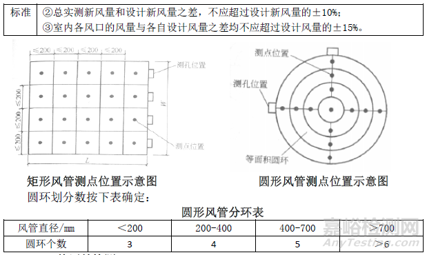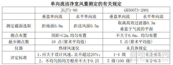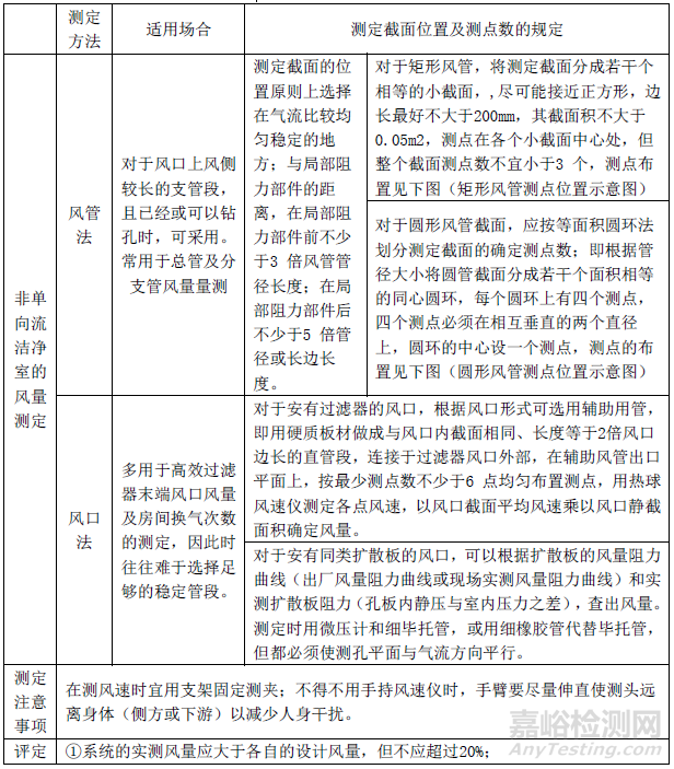 非單向流(亂流)潔凈室的風量可以用風管法和風口法兩種方法量測,關(guān)于截面的取法和測點的布置見下表