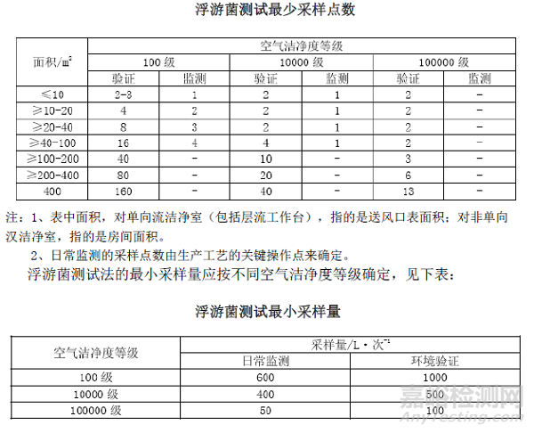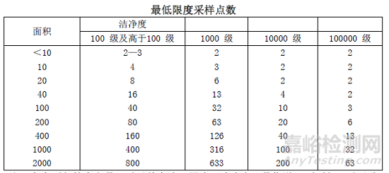 (1)測定潔凈度的最低限度采樣點數(shù)按下表的規(guī)定確定。每點采樣次數(shù)不小于3 次,各點采樣次數(shù)可以不同。