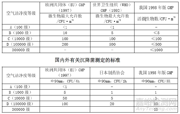 國內(nèi)外有關(guān)浮游菌和沉降菌測定的標準詳見下面兩張表: