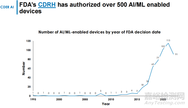 迄今為止,F(xiàn)DA已經(jīng)批準(zhǔn)了超過500項含有AI元素的器械和診斷產(chǎn)品,審批在2021年達(dá)到了頂峰,獲批產(chǎn)品達(dá)到了115款。