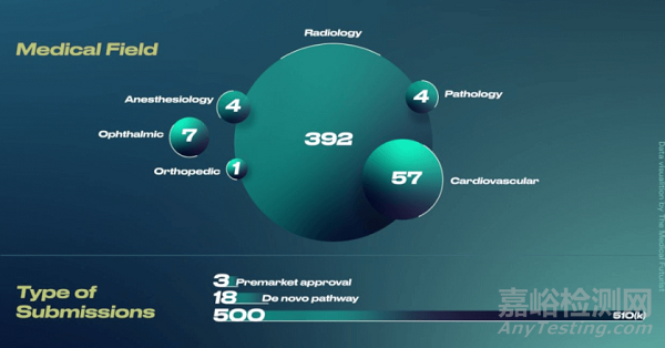 在批準(zhǔn)數(shù)據(jù)方面,放射學(xué)領(lǐng)域獲得最多,擁有多達(dá)392 種批準(zhǔn)的設(shè)備。排在第二位的是心臟病學(xué),有57臺設(shè)備。除此之外,其他專業(yè)(骨科、麻醉學(xué)、病理學(xué)、眼科等)只能看到少數(shù)設(shè)備。主要原因還是放射學(xué)的數(shù)據(jù)量大,深度學(xué)習(xí)能夠大有所為。