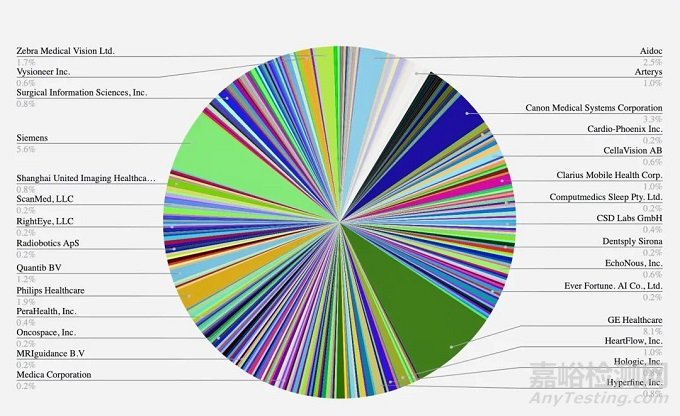 另外有公司擁有多項FDA許可,GE42款設(shè)備;西門子29款設(shè)備;佳能:17 款設(shè)備;Aidoc 13 款;飛利浦10 款設(shè)備;Zebra Medical Vision:9 款設(shè)備獲得批準(zhǔn);上海聯(lián)影醫(yī)療6款設(shè)備。