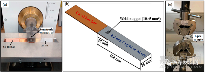 圖2 (a)超聲波金屬焊接設(shè)備;(b)Tab和Busbar尺寸和焊接區(qū)域;(c)T-peel撕力測試