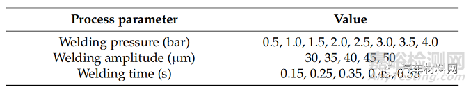 影響焊接質(zhì)量的三個主要參數(shù):焊接壓力,焊接時間,焊接振幅。焊接參數(shù)水平和組合見表3。觸發(fā)延遲0.2s,此時氣缸壓強轉(zhuǎn)化為焊接壓力。