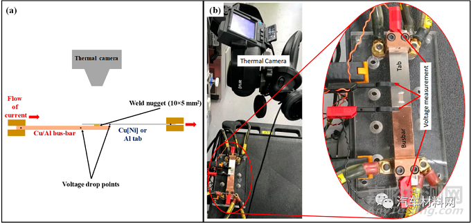 圖3 Tab-to-Busbar接頭的電阻和溫升性能測試裝置。(a)測試原理圖;(b)測試裝置