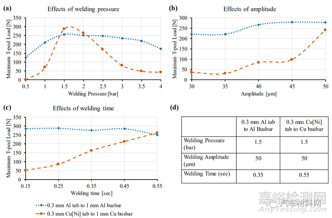 本次研究對比了不同組合下的Tab和Busbar焊接接頭的機械強度、電阻和溫升特性。對0.3mm的Al 和 Cu[Ni] Tab焊接到不同厚度的Al和Cu Busbar的接頭的關(guān)鍵質(zhì)量指標(biāo):機械強度、電阻和溫升進(jìn)行了評價。用T-peel拉力試驗機測試了接頭的機械強度,得到最佳焊接參數(shù)。對于0.3mm Al Tab和Al Busbar的超聲波焊接,焊接壓力1.5Bar,焊接振幅50µm,焊接時間0.35s;對于0.3mm Cu[Ni] Tab 和 Cu Busbar 的超聲波焊接,焊接壓力1.5Bar,焊接振幅50µm,焊接時間0.55s。用以上最佳參數(shù)進(jìn)行打樣,并對樣件進(jìn)行電阻和溫升特性測試。有以下結(jié)論: