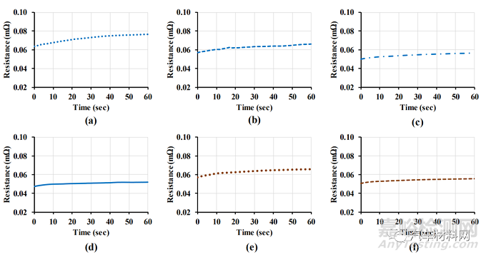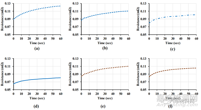 因此,我們可以觀察到:隨著Busbar厚度增加,起始電阻逐漸減小。這是由于當(dāng)電流大小保持不變時,電阻隨截面積的增加而減小。例如,0.3mmAL Tab與1.0mm, 1.5mm, 2.0mm和2.5mm的AL Busbar焊接后起始電阻分別為0.089mΩ, 0.087mΩ, 0.080mΩ和0.065mΩ;0.3mmAL Tab與1.0mm, 1.5mm和2.0mm的Cu Busbar焊接后起始電阻分別為0.084mΩ、0.083mΩ和0.080mΩ。Cu Busbar起始電阻變化相對較小。