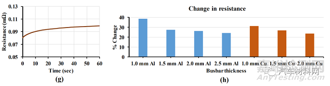 另外,Busbar厚度越小,隨著通電時間增加,電阻變化越大。例如,0.3mmAL Tab與1.0mmAL Busbar焊接接頭在通電過程中電阻增加了0.034mΩ。對應(yīng)1.5mm AL Busbar,電阻增加了0.024mΩ;對應(yīng)2.0mm AL Busbar,電阻增加了0.021mΩ;對應(yīng)2.5mm AL Busbar,電阻增加了0.016mΩ。同樣的變化也發(fā)生在AL Tab與不同厚度的銅Busbar的焊接接頭上。變化百分比見圖5(h)。