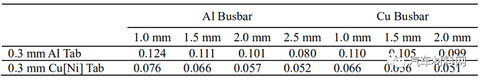 0.3mmCu[Ni] Tab與1.0mmAL Busbar焊接接頭在通電過程中電阻增加了0.013mΩ。對應(yīng)1.5mm AL Busbar,電阻增加了0.010mΩ;對應(yīng)2.0mm AL Busbar,電阻增加了0.006mΩ;對應(yīng)2.5mm AL Busbar,電阻增加了0.005mΩ。