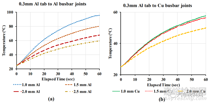 一般來說,由于銅的熱傳導(dǎo)系數(shù)大且電阻相對較低,因此采用Cu Busbar的接頭溫度要低于采用AL Busbar接頭溫度。例如,0.3mm AL Tab和2.0mm AL Busbar的焊接頭溫升67.83℃,要高于0.3mm AL Tab和2.0mm Cu Busbar的焊接頭溫升50.07℃。圖7(a)和(b)表示0.3mmAL Tab焊接到不同厚度的AL 和Cu Busbar的溫度響應(yīng)曲線。Cu Busbar 的溫升明顯小于Al Busbar 溫升。因此,當(dāng)采用AL Tab時,Cu Busbar的接頭熱學(xué)性能更好。