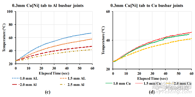 圖7 在250A電流下60s內(nèi)的溫升曲線,(a)0.3mm Al Tab焊接到Al Busbar,(b)0.3mm Al Tab焊接到Cu Busbar,(c)0.3mm Cu[Ni] Tab焊接到Al Busbar,(d)0.3mm Cu[Ni] Tab焊接到Cu Busbar。