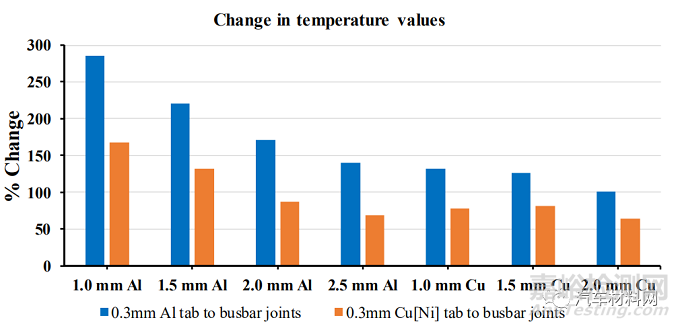 溫升曲線表明,隨著Busbar厚度增加,接頭處測量的最高溫度降低。此外,Cu[Ni] Tab的平均溫升只有AL Tab的0.6倍。