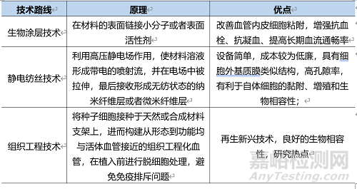 常用的人工血管制備技術(shù)包括生物涂層技術(shù)、靜電紡絲技術(shù)和組織工程技術(shù),具體對(duì)比如下表: