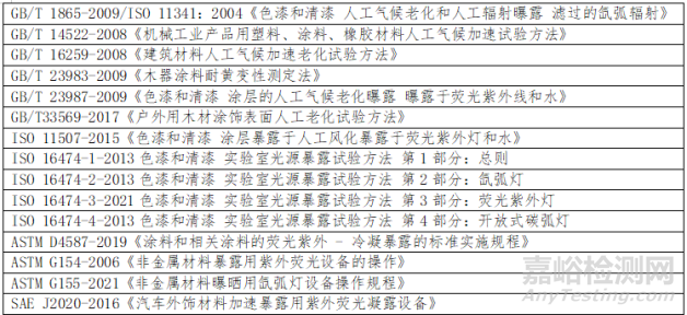 涂料常見人工加速老化實驗的相關(guān)標準如下: