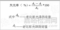 目測漆膜老化前后的光澤改變程度及按GB/T 9754測定老化前后的光澤,核算失光率。用下式核算失光率(%):
