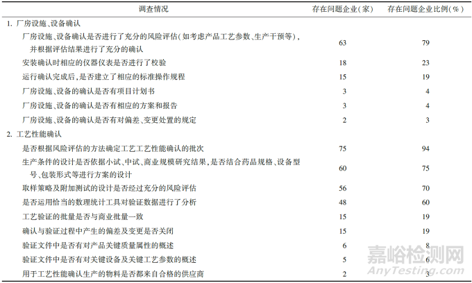 此外,學(xué)術(shù)界和工業(yè)界的幾位老師,也在近年發(fā)表過(guò)文章《我國(guó)藥品首次工藝驗(yàn)證存在問(wèn)題及探討》[2],對(duì)我國(guó)80家藥企執(zhí)行首次工藝驗(yàn)證情況進(jìn)行調(diào)查,調(diào)查內(nèi)容和結(jié)果見(jiàn)表1。