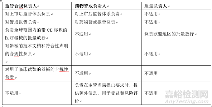 表1:根據(jù)歐盟MDR和MPD,監(jiān)管合規(guī)負(fù)責(zé)人、藥物警戒負(fù)責(zé)人和質(zhì)量負(fù)責(zé)人的監(jiān)管職責(zé)概覽