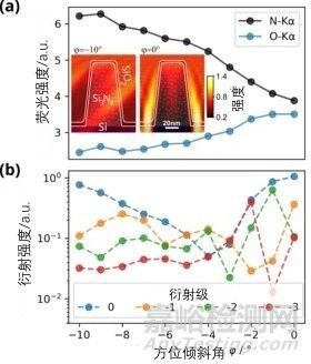 圖示:氮化硅晶格樣品的混合測(cè)量結(jié)果。改變方位角,在680 eV(電子伏特)的激發(fā)能下,測(cè)量氮和氧的熒光(a),以及前三個(gè)衍射級(jí)的散射(b)。圖(a)還顯示了在不同方位角下該結(jié)構(gòu)的晶胞內(nèi)局部場(chǎng)分布的模擬情況。