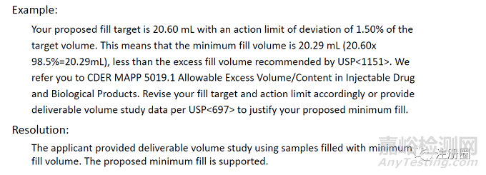 注射液的灌裝量不滿足USP<1151>規(guī)定的過(guò)量灌裝體積(目標(biāo)灌裝量20.60mL,偏差1.50%,則最小灌裝量為20.60mL×98.5%=20.29mL,小于按USP<1151>針對(duì)20mL的過(guò)量灌裝為0.60mL計(jì)算的最小灌裝量20mL+0.60mL=20.60mL),被要求修改目標(biāo)灌裝量和行動(dòng)限,或者根據(jù)USP<697>提供可抽取體積數(shù)據(jù)來(lái)證明最小灌裝量的合理性。
