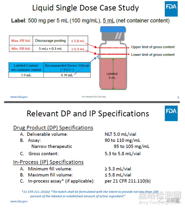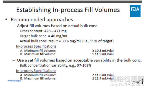最后,F(xiàn)DA建議在放行時(shí)將每瓶總含量作為藥品標(biāo)準(zhǔn)之一進(jìn)行評(píng)估,以確保符合21 CFR 201.51(g)規(guī)定的注射藥品灌裝量要求。
