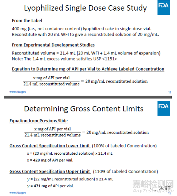復(fù)溶/稀釋后標(biāo)示濃度(mg/mL) × 復(fù)溶/稀釋后總體積 =總含量測(cè)試的可接受標(biāo)準(zhǔn)下限