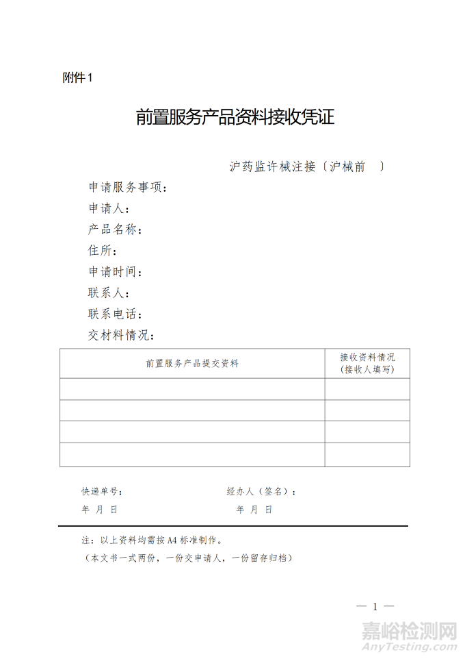 申請人可在正式提出創(chuàng)新特別審查申請之前,按照《上海市第二類創(chuàng)新醫(yī)療器械特別審查程序》《上海市第二類創(chuàng)新醫(yī)療器械特別審查申報資料編寫指南(試行)》的要求,將相關申請資料當面提交或郵寄至上海市藥品監(jiān)督管理局行政服務中心(以下簡稱:行政服務中心;地址:宜山路728號3號樓底樓大廳)。行政服務中心出具《前置服務產品資料接收憑證》(附件1)。器審中心成立創(chuàng)新審查服務組,自接收資料后10個工作日內完成預審查。
