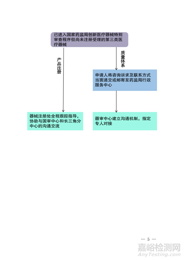 器械注冊處負責對進入國家創(chuàng)新醫(yī)療器械特別審查程序的產品注冊開展全程跟蹤指導,爭取國家藥品監(jiān)督管理局醫(yī)療器械技術審評中心(以下簡稱“國審中心”)和國家藥品監(jiān)督管理局醫(yī)療器械技術審評檢查長三角分中心(以下簡稱“長三角分中心”)的指導,協(xié)助申請人開展溝通交流。