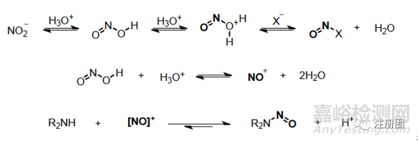 在進(jìn)行亞硝胺風(fēng)險(xiǎn)評(píng)估時(shí),通常認(rèn)為亞硝胺的生成需要三個(gè)要素:亞硝化試劑、胺和酸性條件。首先,為什么一定需要酸性條件呢?亞硝化試劑如亞硝酸鹽本身并不是有效的N-亞硝化試劑,但在弱酸性條件下可以形成更具反應(yīng)性的亞硝鎓離子鹽[NO]+或N2O3。