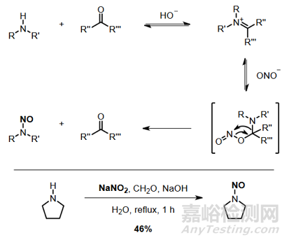 活性羰基類化合物特別是甲醛、吡哆醛和一些苯甲醛可以在NO2−的中性和堿性溶液中從二級(jí)胺中產(chǎn)生亞硝基胺[1] [2]。反應(yīng)速率隨著對(duì)氮原子的立體位阻而變化,但所有反應(yīng)速率都比酸性條件下的經(jīng)典N-亞硝基化反應(yīng)慢得多。如下圖所示: