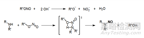在堿性條件仲胺可以與亞硝酸酯發(fā)生類似酯交換的反應(yīng),在堿性環(huán)境得到亞硝胺的速度小于酸性水環(huán)境。如下圖所示: