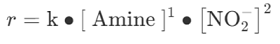 亞硝化反應(yīng)速率與胺濃度和亞硝酸鹽濃度的平方成正比。研究發(fā)現(xiàn) N-亞硝胺形成速率 (r) 與胺含量成正比,因此 N-亞硝化反應(yīng)的速率受亞硝酸鹽濃度的影響更大[3]。[Amine]代表相關(guān)胺的含量,[ NO2−]代表亞硝酸鹽含量,按下式: