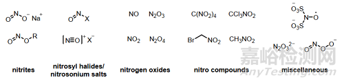 常見(jiàn)的亞硝化試劑或其前體有亞硝酸鈉(NaNO2)和亞硝酸叔丁酯(t-BuONO),亞硝酸(HNO2),一氧化氮(NO),亞硝酰鹵化物(XNO,X=鹵素),三氧化二氮(N2O3)和四氧化二氮(N2O4)。