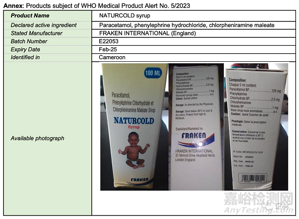 在產(chǎn)品包裝上列出的生產(chǎn)商為 Fraken International(英格蘭),但英國監(jiān)管機構 MHRA 向 WHO 證實,英國不存在該公司。WHO 仍在繼續(xù)調(diào)查以查找該產(chǎn)品的來源。